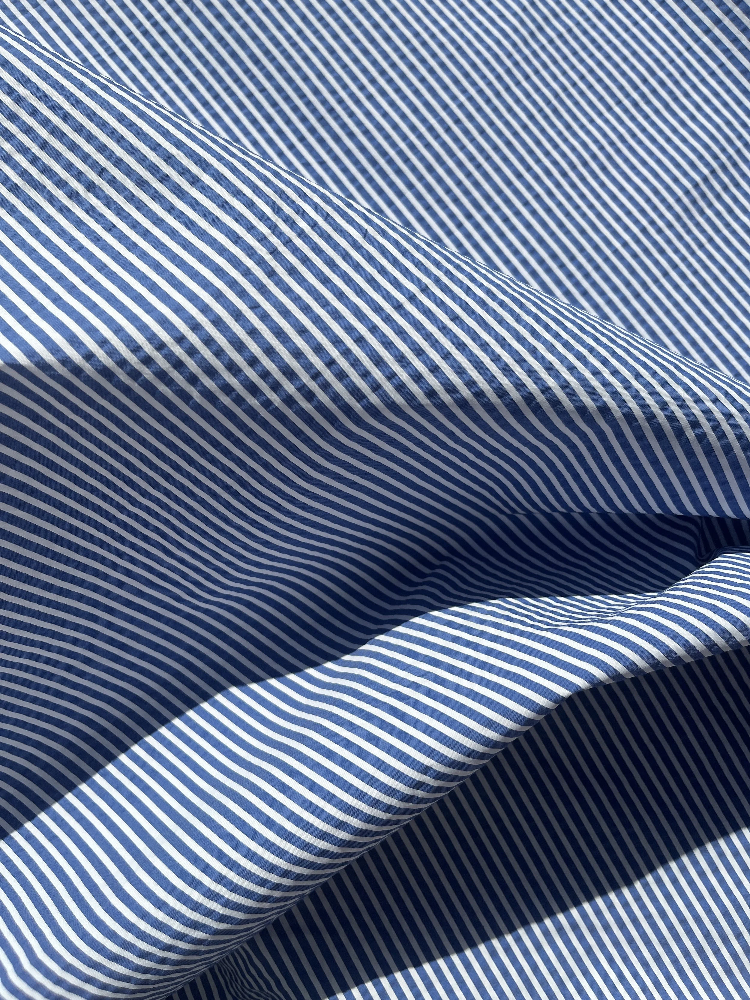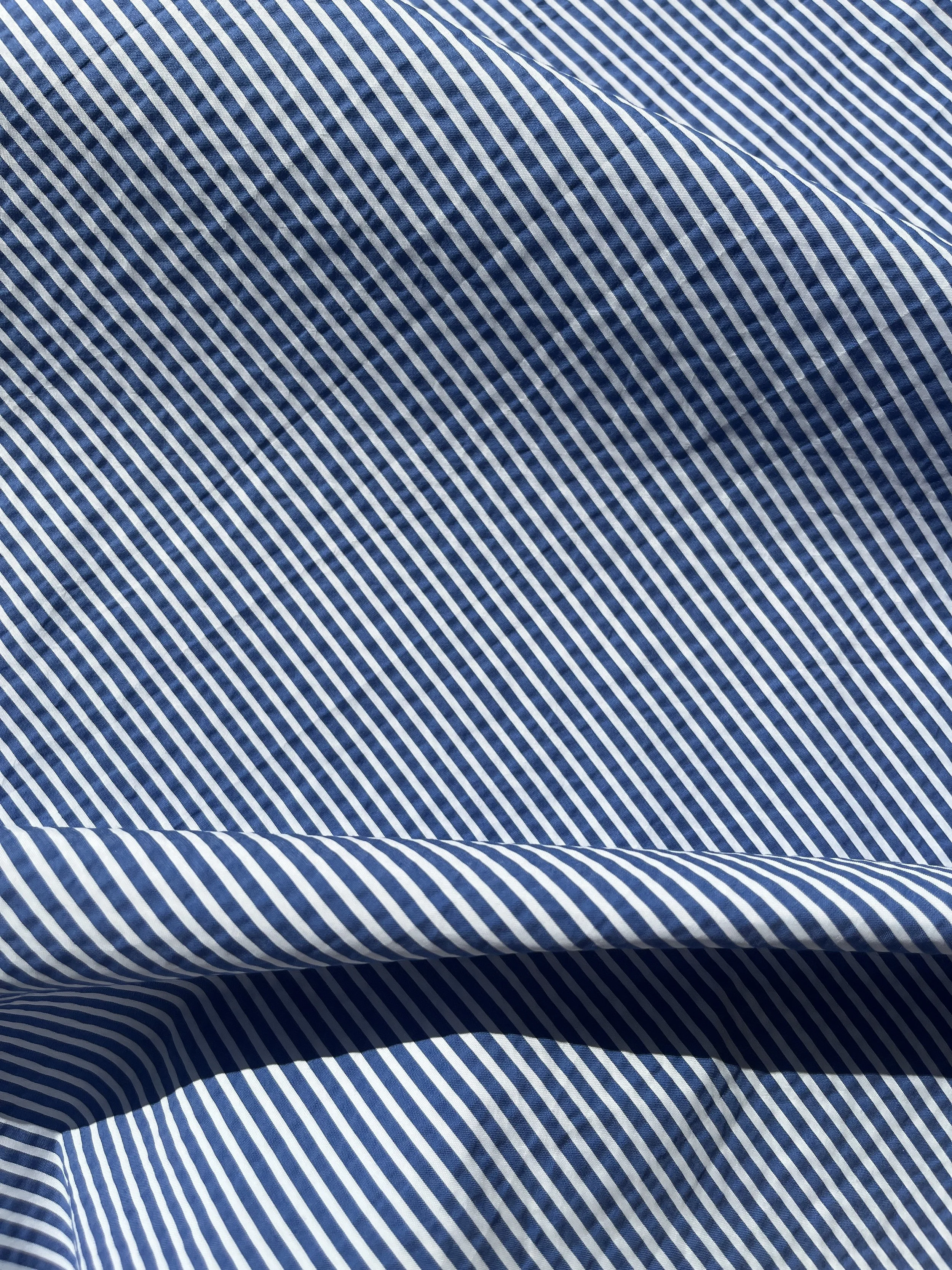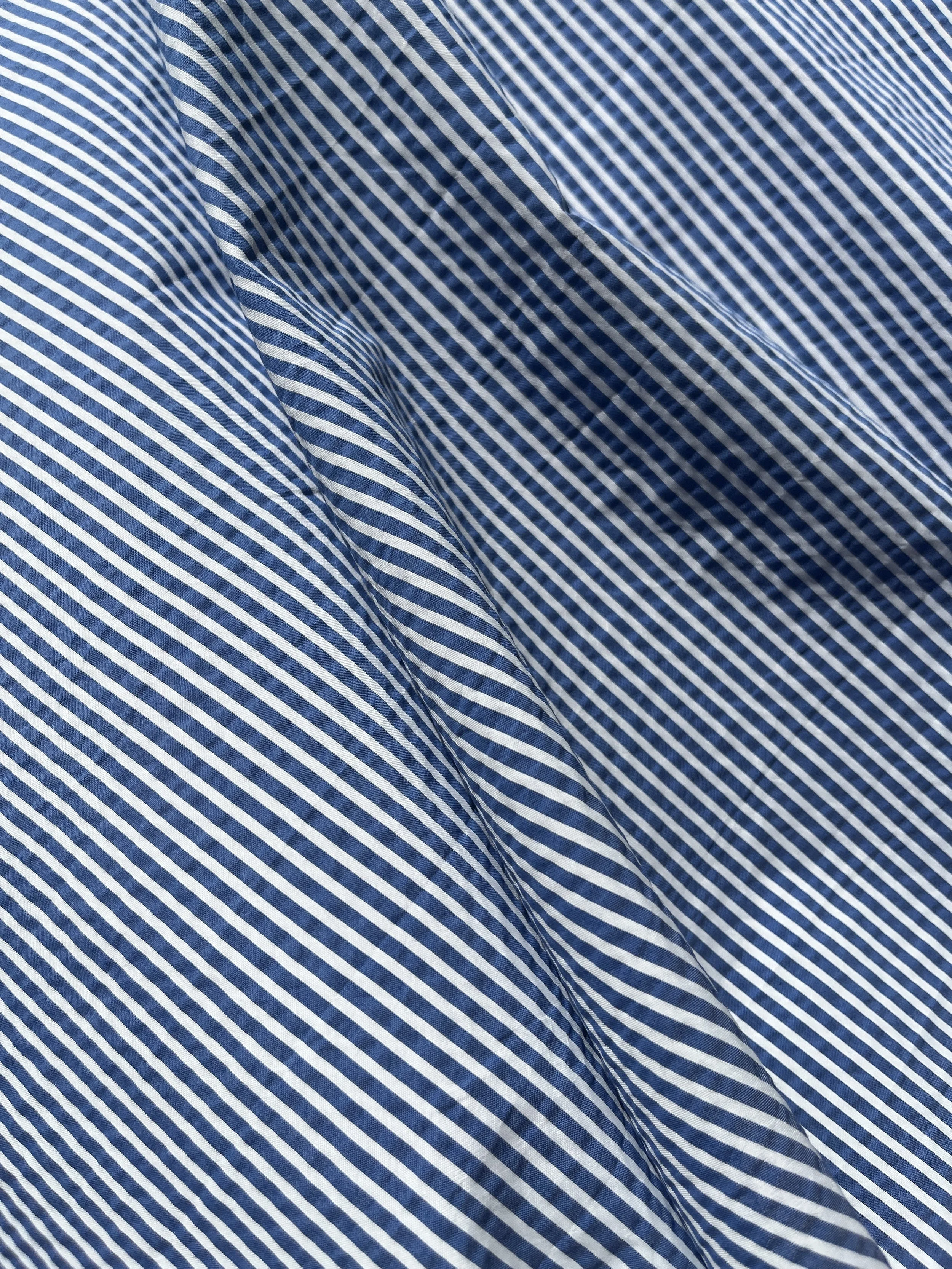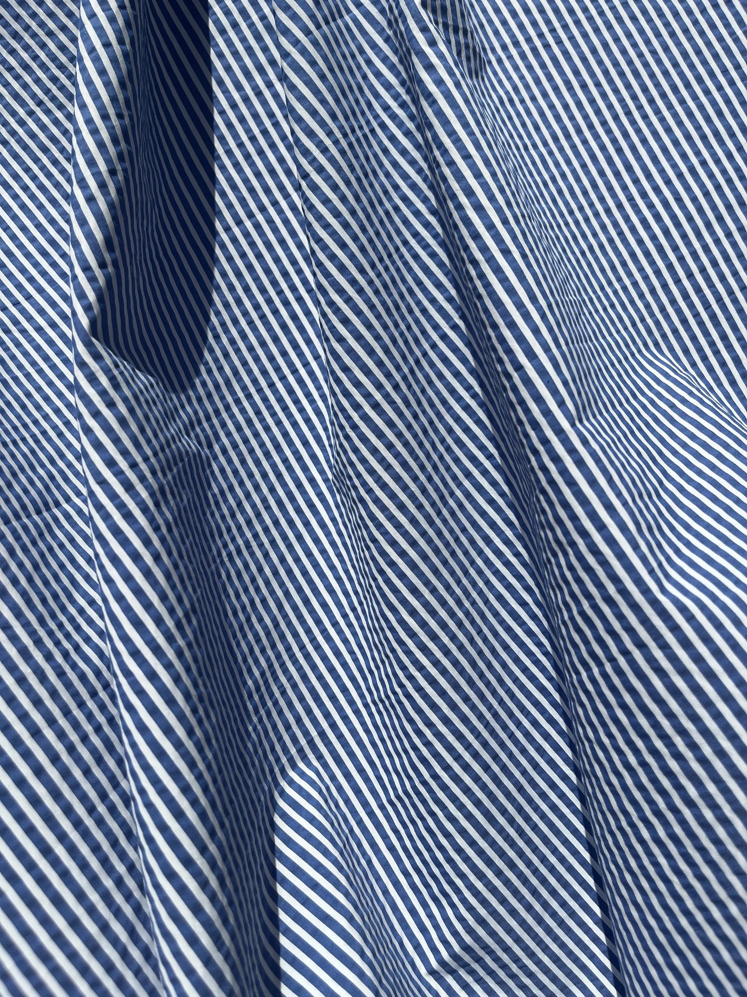 Cotton / polyester seersucker blend in blue and white stripe