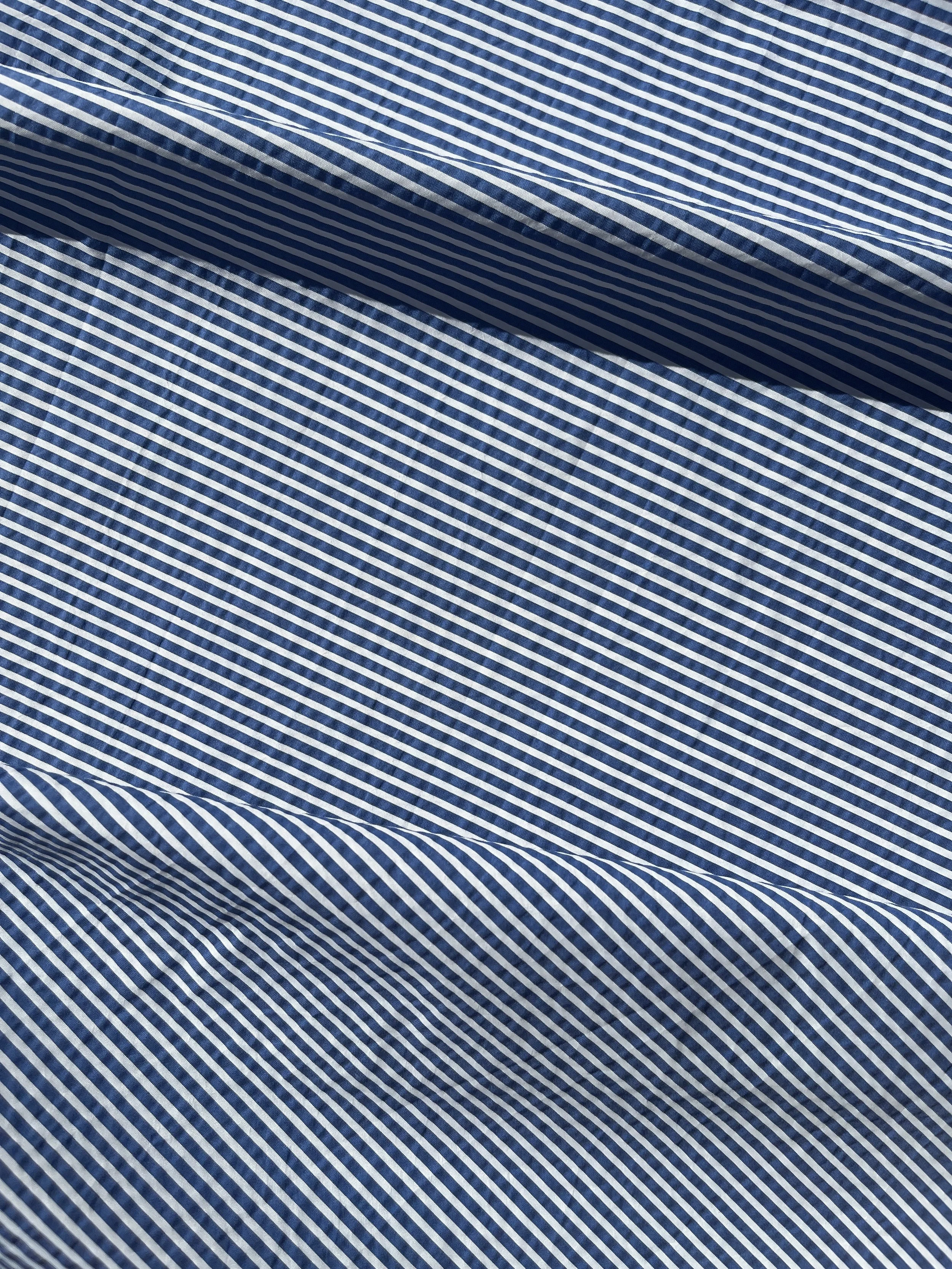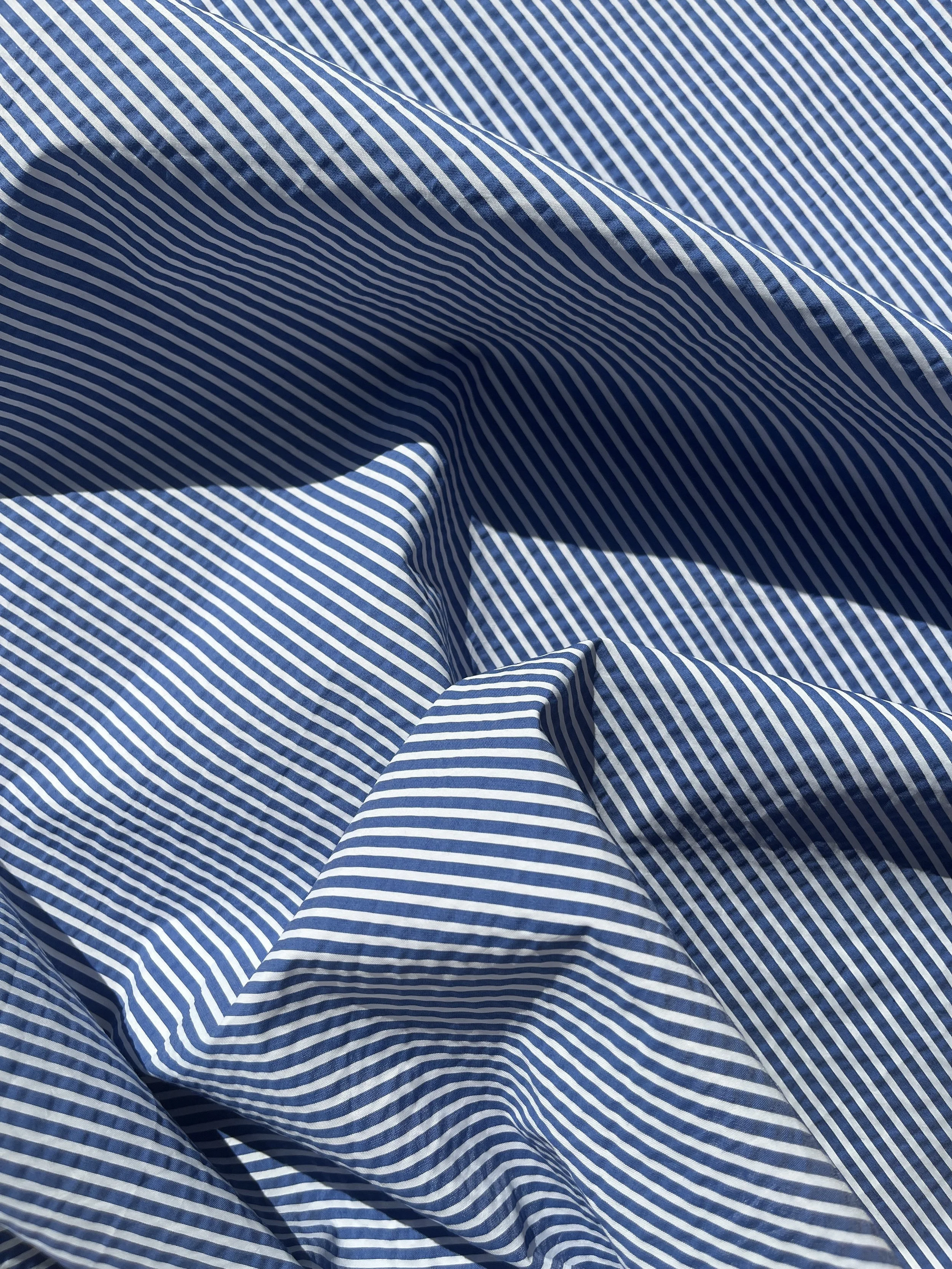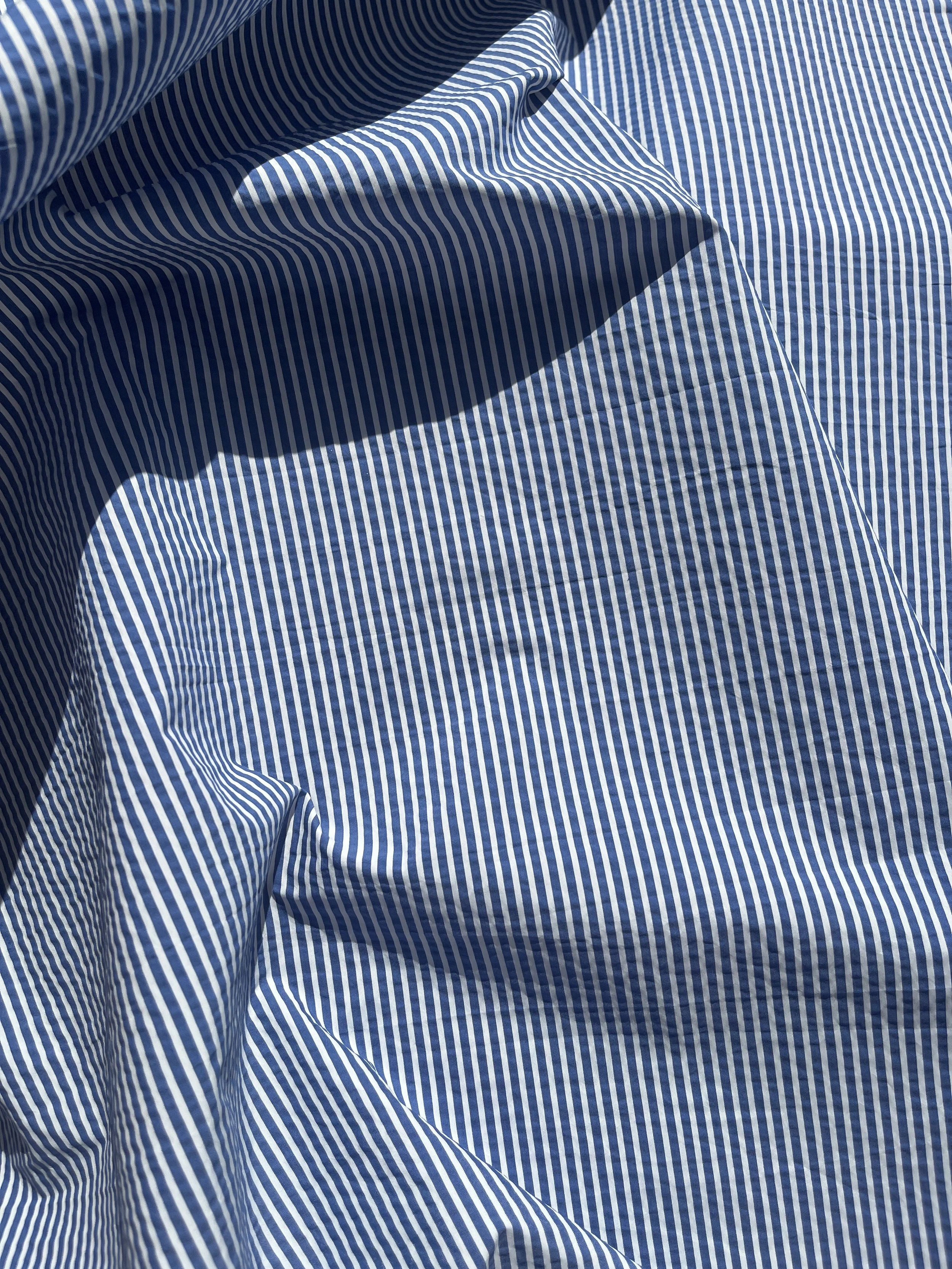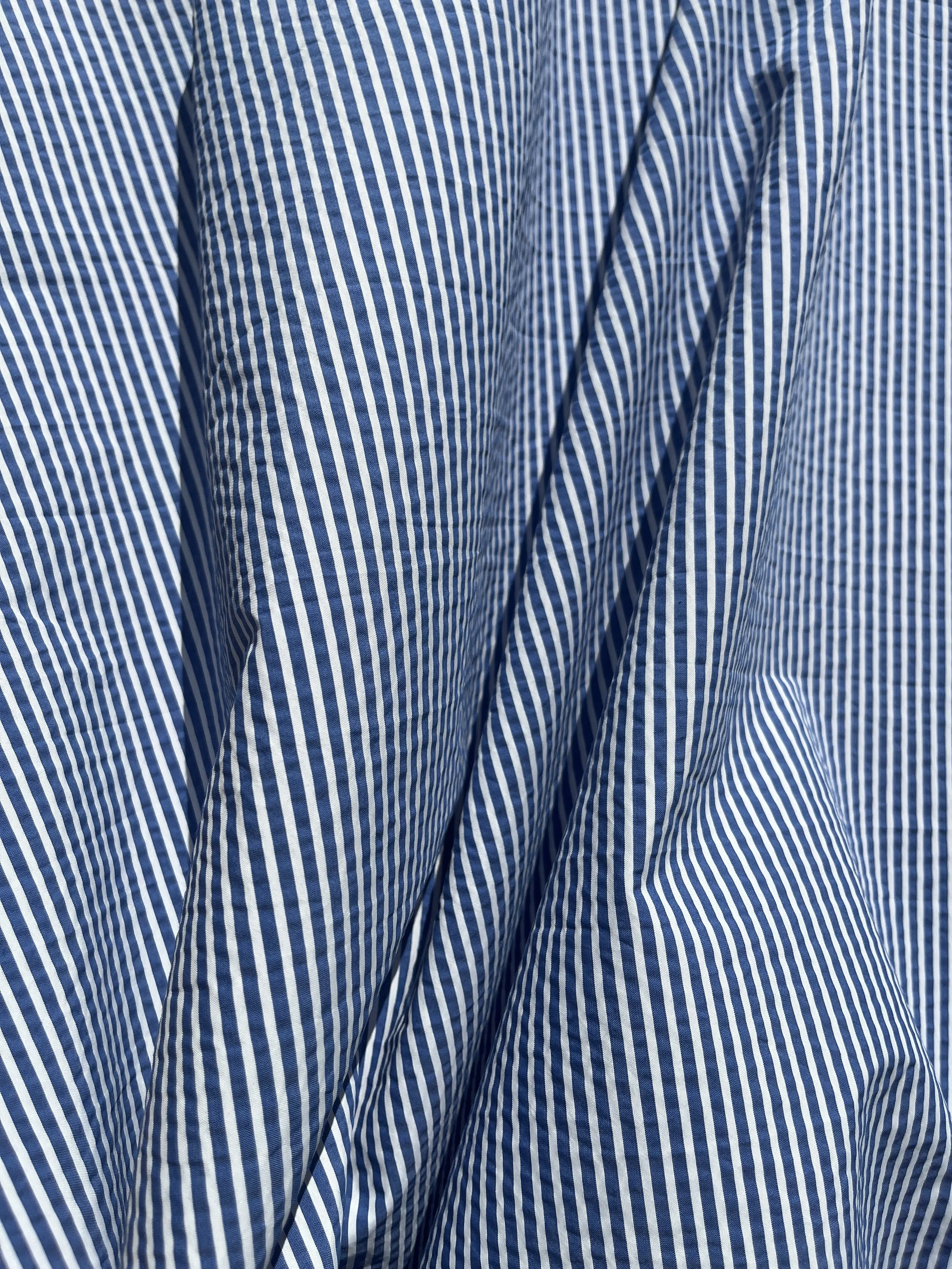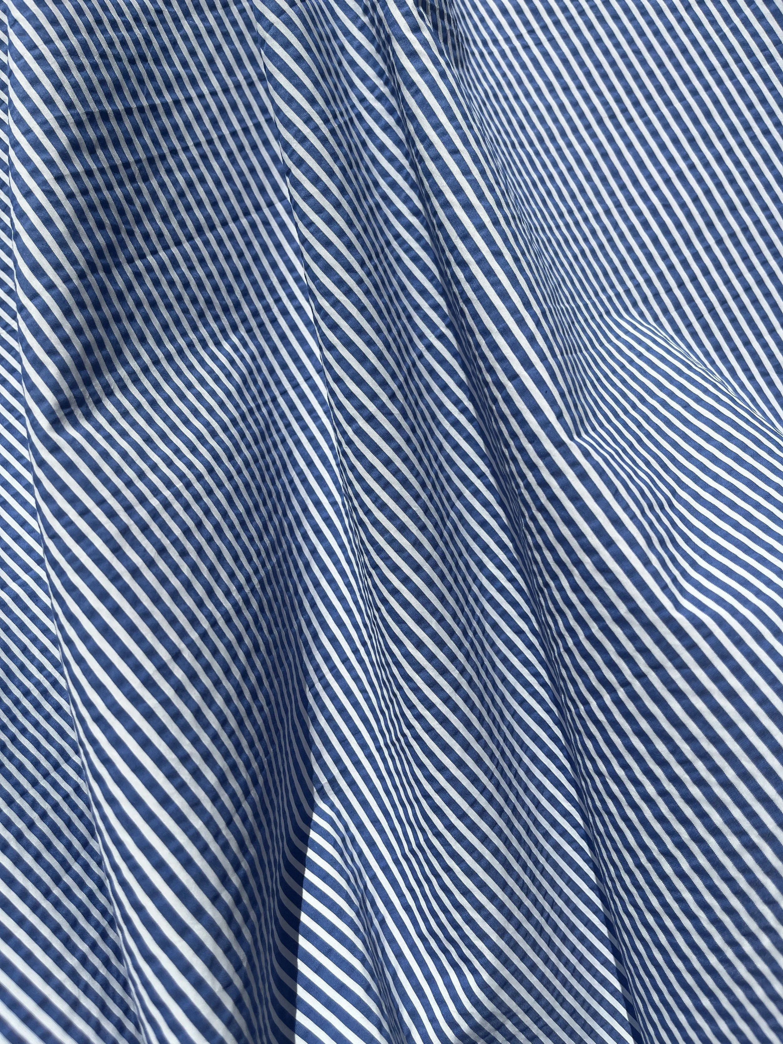 Cotton / polyester seersucker blend in blue and white stripe. It would be suitable for summer clothing - dresses, shirts, shorts.