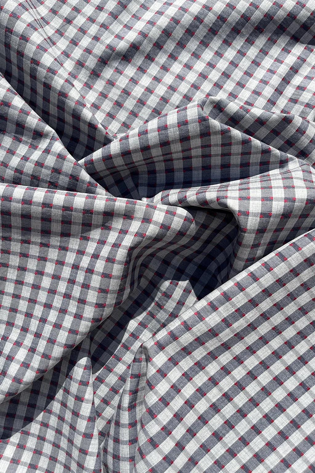 Italian ex-designer woven cotton shirting in shades of blue with a red dot pattern. This is a lovely and unusual shirting - perfect for shirts, dresses and tops